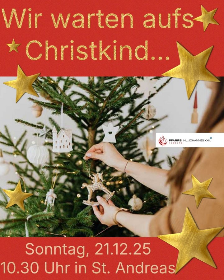Gemeinsam wollen wir uns auf Weihnachten vorbereiten und die „Wartezeit“ etwas verkürzen. Kinder und Erwachsene sind herzlich eingeladen am Sonntag, 21.12.25 um 10.30 Uhr in die Kirche St. Andreas zu kommen.