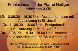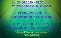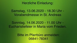 Bitte melden Sie sich bis Freitag 12.Juni 11.00 Uhr im Pfarrbüro an unter Tel. 06841-78341 Öffnungszeiten der Kirchen zum stillen Gebet: St. Andreas: 11 Uhr bis 18 Uhr St. Remigius: 10 Uhr bis 17 Uhr weiterlesen
