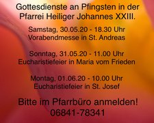In der Pfarrei Hl. Johannes XXIII. werden ab dem Pfingstwochenende wieder die gewohnten Wochenendgottesdienste in den einzelnen Gemeinden angeboten. In Beeden finden auf Wunsch des Gemeindeausschusses bis auf weiteres keine... weiterlesen