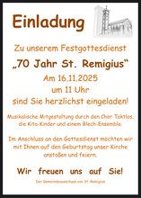 Herzliche Einladung zum Festgottesdienst 70 Jahre St. Remigius am 16. November 2025 um 11.00 Uhr in der Kirche St. Remigius.