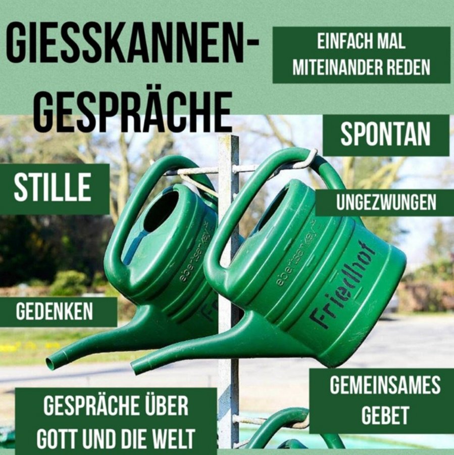 In den Zeiten der Lockdowns und der Beerdigungen „nur“ im Familienkreis ist es besonders auf dem Friedhof in Erbach aufgefallen, dass die Menschen mit einer Gießkanne zum Friedhof gekommen sind, um an den Trauerfeiern teilzunehmen. Schnell ist man über das Thema Gießkanne ins Gespräch gekommen, weil es scheinbar die einzige Möglichkeit war, sich von den Verstorbenen zu verabschieden. Das hat uns auf die Idee gebracht, ein lockeres Gesprächsangebot über „Gott und die Welt“ auf unseren Friedhöfen anzubieten. Wir Seelsorger sind zum spontanen Gespräch oder einem gemeinsamen Gebet am Grab ihrer Angehörigen ansprechbar. Gerne können Sie dafür auch einen Termin mit uns vereinbaren.