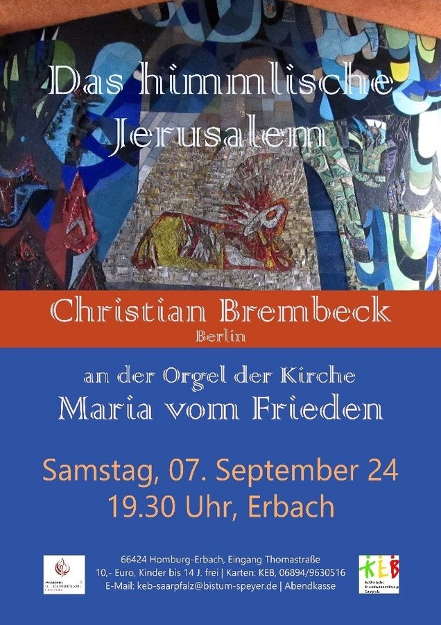 Die Kirche Maria vom Frieden in Homburg-Erbach ist in ihrer Ausstattung in mehrfacher Hinsicht bemerkenswert: Neben dem Kreuzweg und der Schutzmantelmadonna des Speyerer Künstlers Günter Zeuner sind insbesondere die Ost- und die Westwand der Kirche zu nennen. Das prachtvolle, große Westfenster, gestaltet von Wilhelm Braun (München), zeigt Maria als Königin des Friedens; die gegenüberliegende Chorwand wird ausgefüllt von dem von der Künstlerin Helena Trossen (Essen) entworfenen, nicht minder beeindruckenden Mosaik mit Motiven der christlichen Verheißung des wahren und endgültigen Friedensreiches Gottes, des himmlischen Jerusalem als Wohnung Gottes unter den Menschen und Wohnung der Menschen bei Gott. Die Hoffnung auf dieses himmlische Jerusalem hat zahllose Musiker zu wunderbaren Musikwerken inspiriert. Mit einem eigens für den Anlass konzipieren Programm wird der international renommierte Musiker Christian Brembeck (Berlin) diese Verheißung an der Zeilhuber-Gaida-Orgel musikalisch zum Klingen bringen.