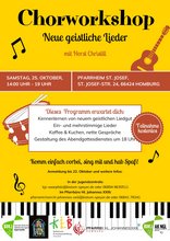 Einladung zum Chorworkshop Neue geistliche Lieder mit Horst Christill am Samstag, den 25. Oktober von 14.00 - 19.00 Uhr im Pfarrheim St. Josef, St.-Josef-Straße 24.