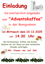 Sie sind herzliche eingeladen zum Adventskaffee in das Remigiusheim am Mittwoch, den 10. Dezember 2025 um 14.30 Uhr.