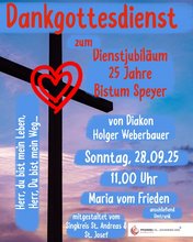 Herzliche Einladung zum Dankgottesdienst anlässlich des 25jährigen Dienstjubiläums von Diakon Holger Weberbauer am Sonntag, den 28. September 2025 um 11.00 Uhr in der Kirche Maria vom Frieden.