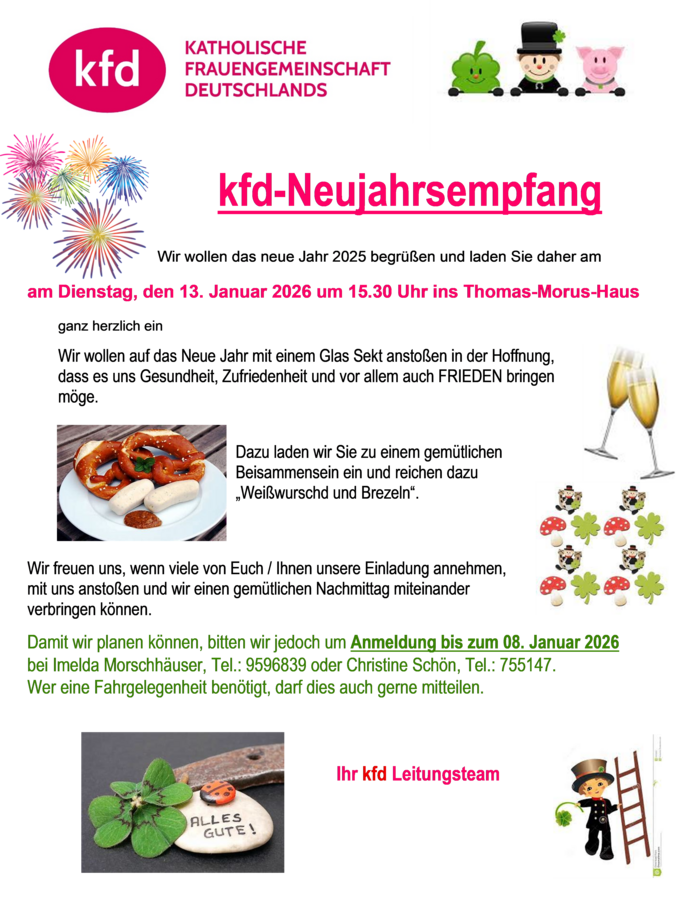 Damit wir planen können, bitten wir jedoch um Anmeldung bis zum 08. Januar 2026 bei Imelda Morschhäuser, Tel. 9596839 oder Christine Schön, Tel. 755147.