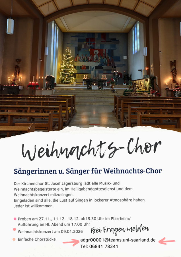 Der Kirchenchor St. Josef lädt alle Musik- und Weihnachtsbegeisterte ein, im Heiligabendgottesdienst und dem Weihnachtskonzert mitzusingen. Eingeladen sind alle, die Lust auf Singen in lockerer Atmosphäre haben. Jeder ist willkommen.