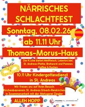Der Kirchenbauverein St. Andreas Erbach-Reiskirchen lädt in Zusammenarbeit mit der Metzgerei Ziegler zum Närrischen Schlachtfest am Sonntag, den 08. Februar 2026 ab 11.11 Uhr ins Thomas-Morus-Haus ein.