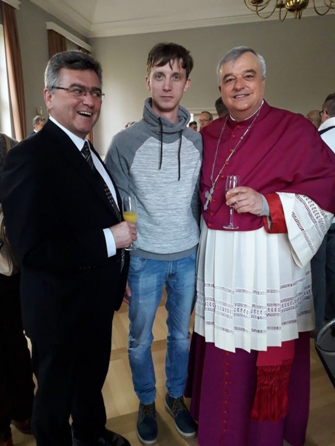 Herr Striesow zusammen mit Pfarrer Weber und Bischof Wiesemann beim anschließenden Empfang im Friedrich-Spee-Haus